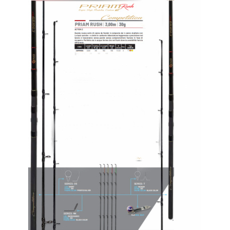 De colmic priam rush is een korte super strakke feeder-hengel. de hengel wordt geleverd met 3 super dunnen carbonne topjes. iedere competitie visser zal deze super deluxe 10ft feederhengels waarderen.